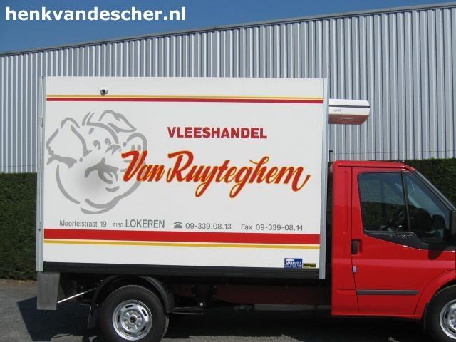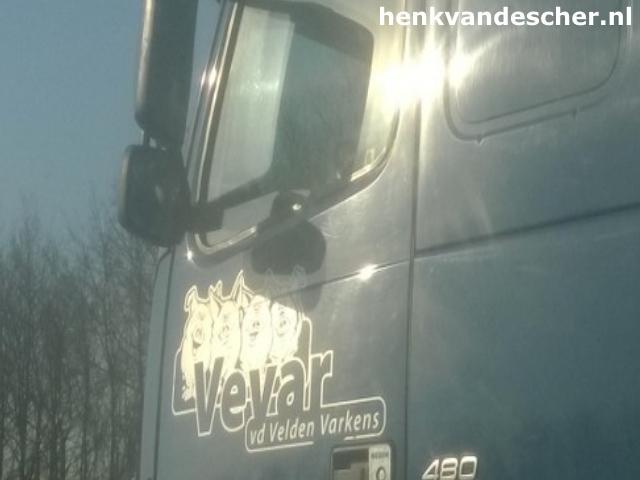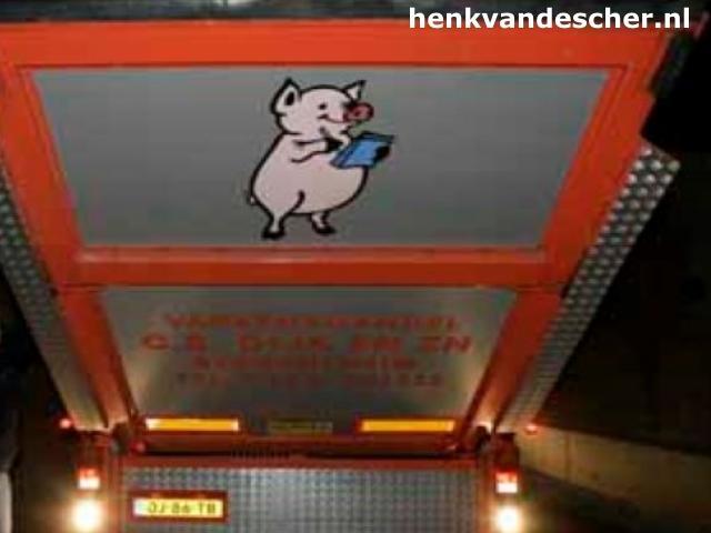 Eén van de vele vrachtwagens met blije varkens achterop.